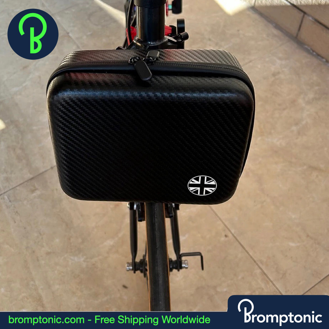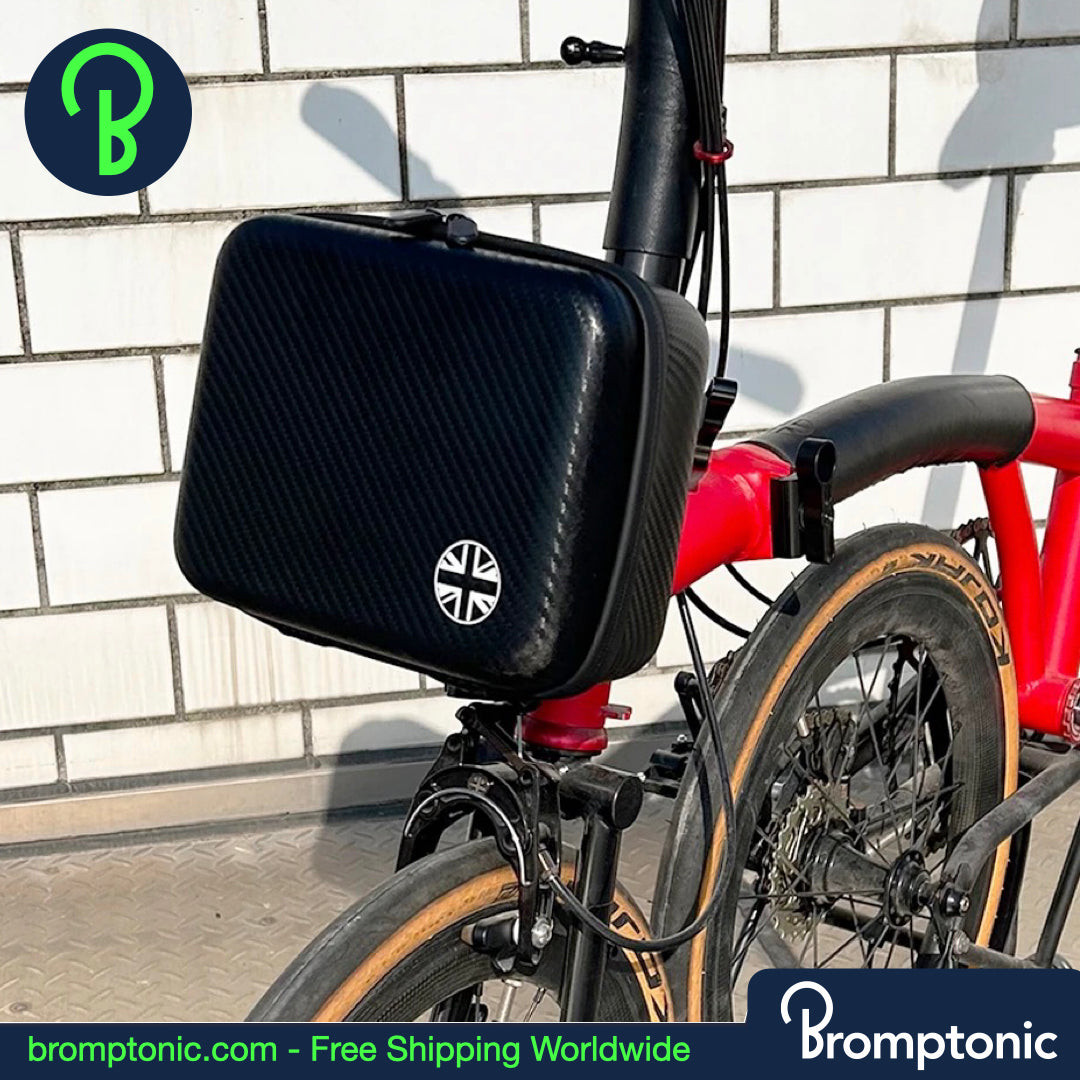 Een compacte, stijlvolle fronttas ontworpen voor Brompton vouwfietsen. Beschikbaar in twee designs - klassiek carbon patroon met Union Jack detail, of gestroomlijnde geribbelde 10" zwarte afwerking - beide bieden dezelfde praktische bruikbaarheid, bescherming en lichtgewicht prestaties.
